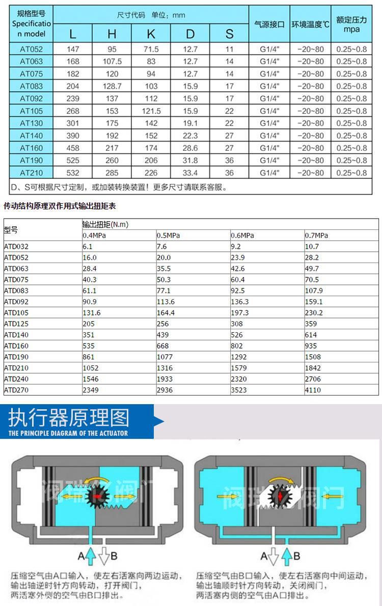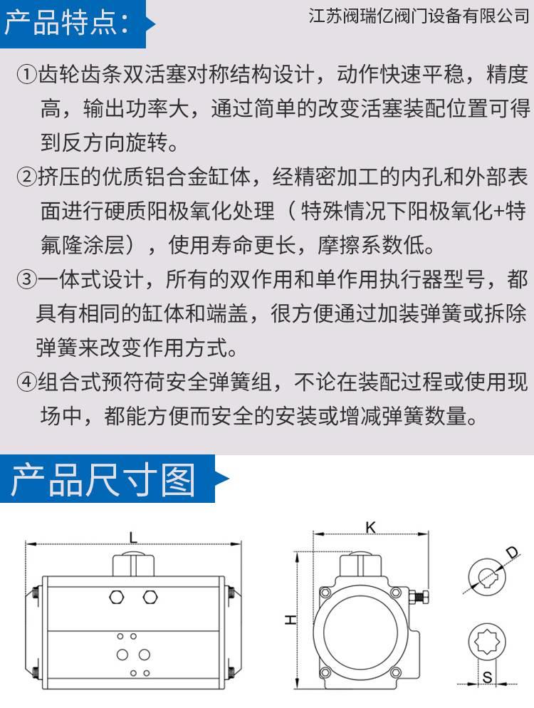 ③整体式设计,所有双作用和单作用执行器型号都兼具相同的缸体和端盖,便于通过增加或卸下弹簧来变动作用方法。